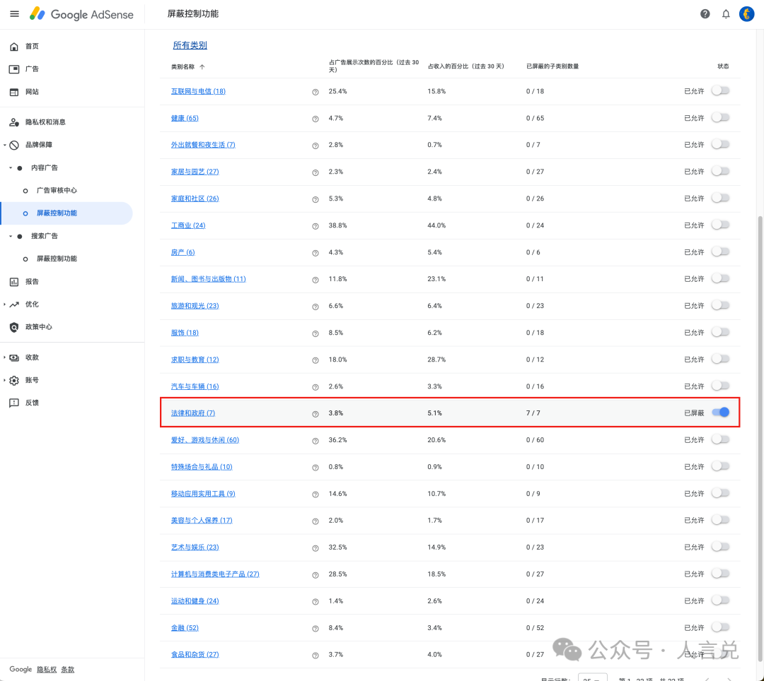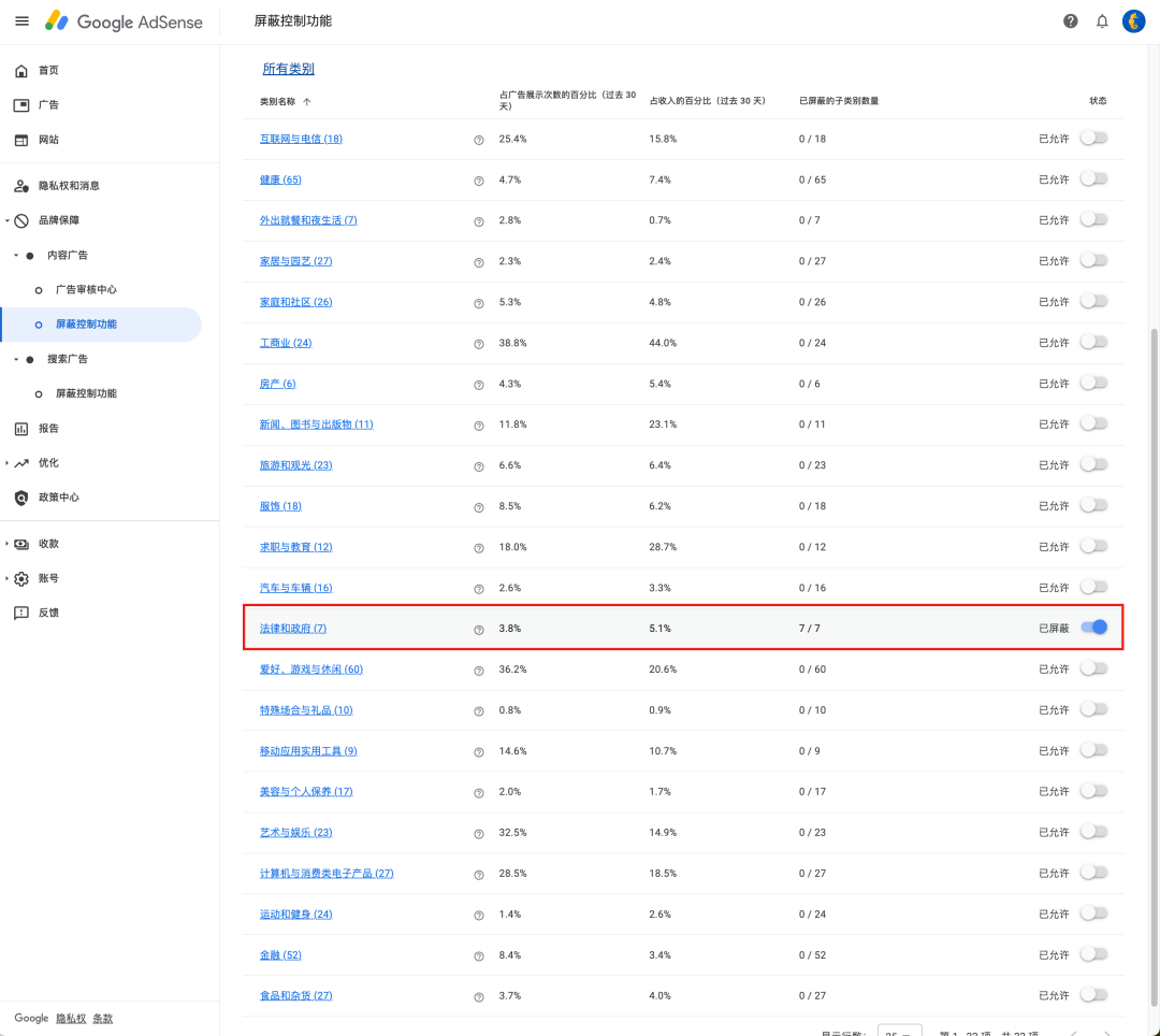 除了敏感类型外,我个人也建议国内站修改常规类别的屏蔽设置,屏蔽「法律和政府」类别: