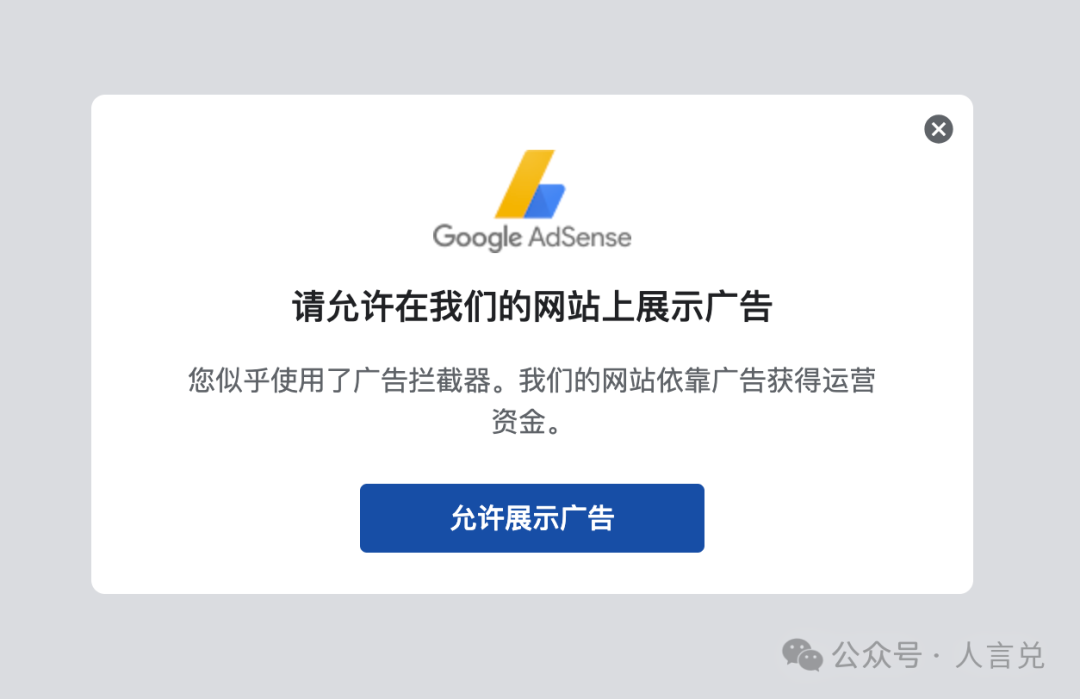 这里有必要说明一下,这个广告拦截收入挽回指的是当用户访问你的网站时,如果他的浏览器上安装运行了一些广告屏蔽插件时,我们的网站是无法展示广告的,也就意味着失去原本应该有的收入(在此也呼吁大家广告插件虽好,但也可以加一些白名单支持一下自己喜欢的网站),添加了广告拦截收入挽回消息后,AdSense 一旦检测到对方开启了广告屏蔽插件,就有可能弹出提示窗口,提示用户允许展示广告。