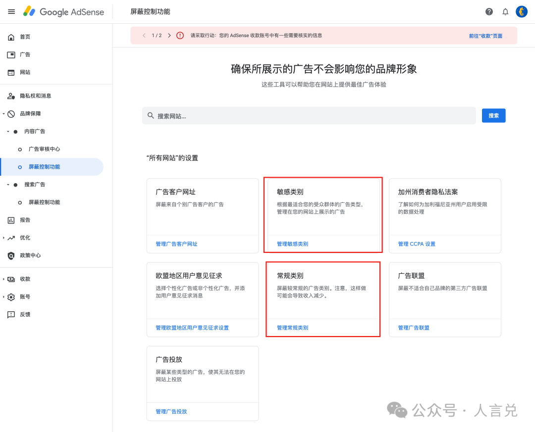 点击 AdSense 左侧菜单栏中的「品牌保障」,其中分为内容广告和搜索广告,重点设置「内容广告」中的「屏蔽控制功能」。