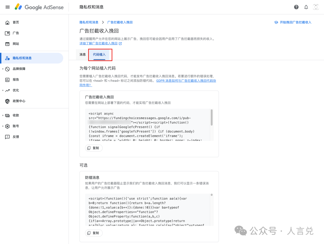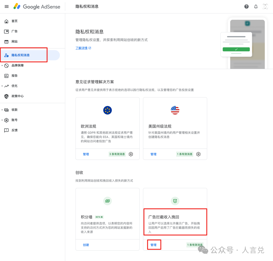 登录你的 Google AdSense,点击左侧菜单中的「隐私权和消息」,可以看到创收下有两个卡片,一个是「积分墙」,另一个则是「广告拦截收入挽回」