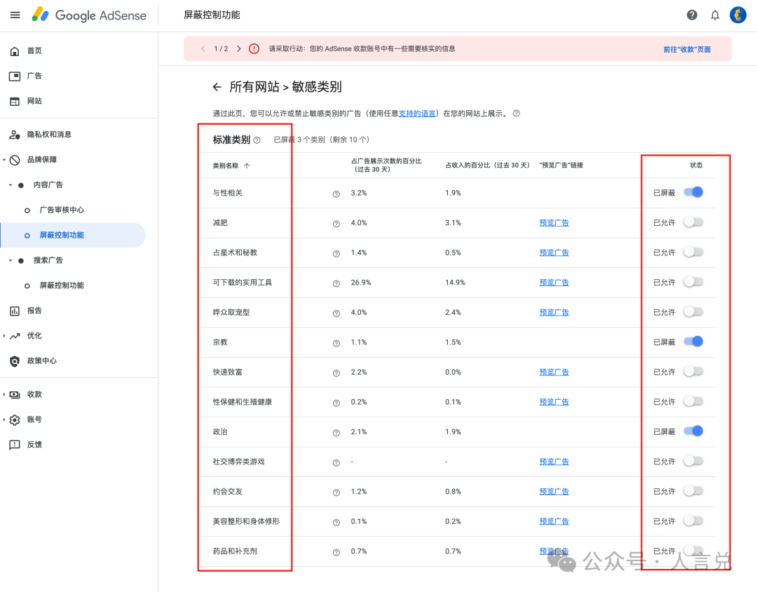 但需要提醒的是,屏蔽了相关类别的广告,你的收入会受到影响,这个根据个人实际情况而定是否屏蔽,以及屏蔽哪些类别。