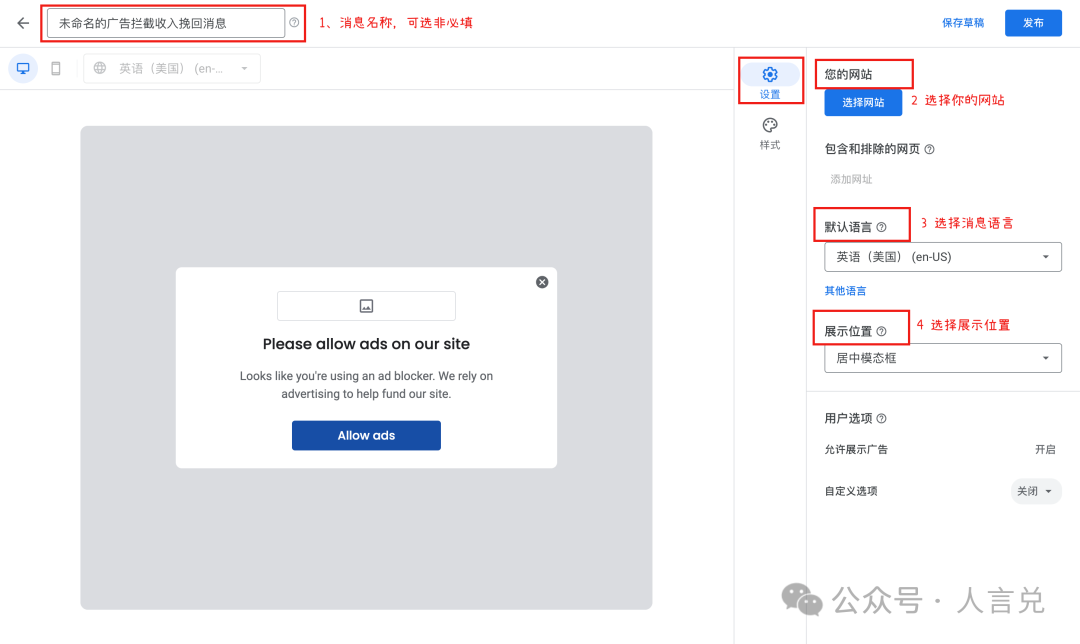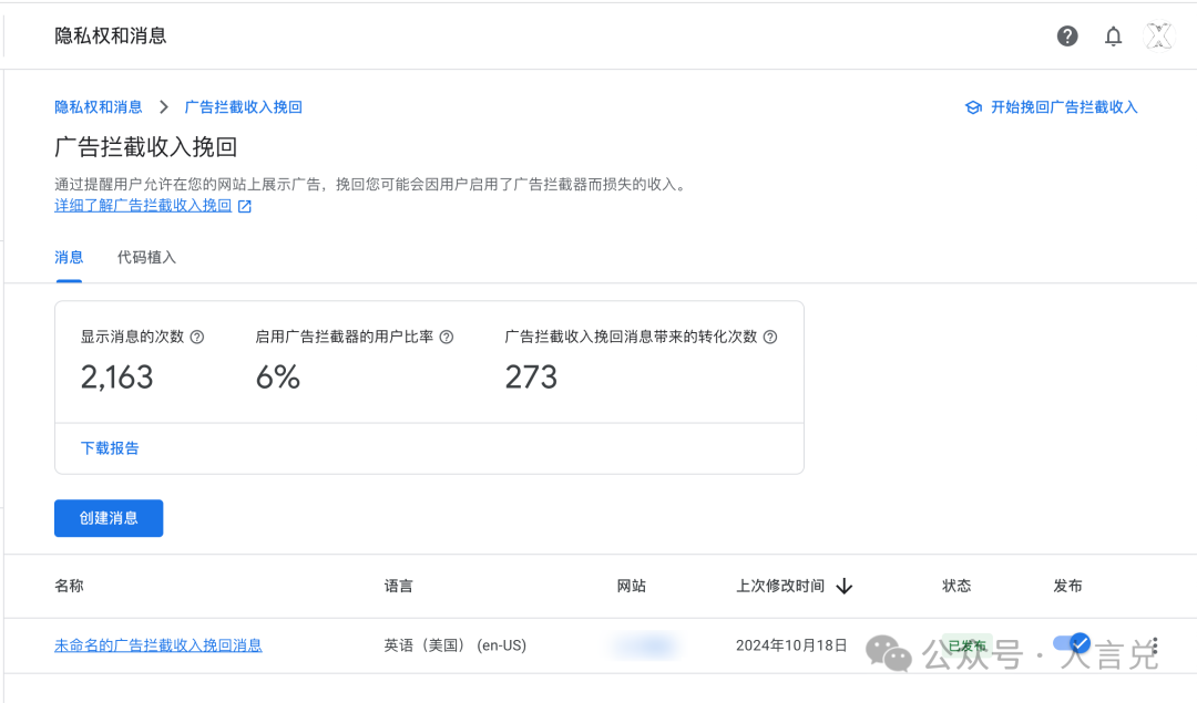 下面开始创建广告拦截收入挽回消息。点击页面上的「创建消息」按钮进入挽回消息设置页面:
