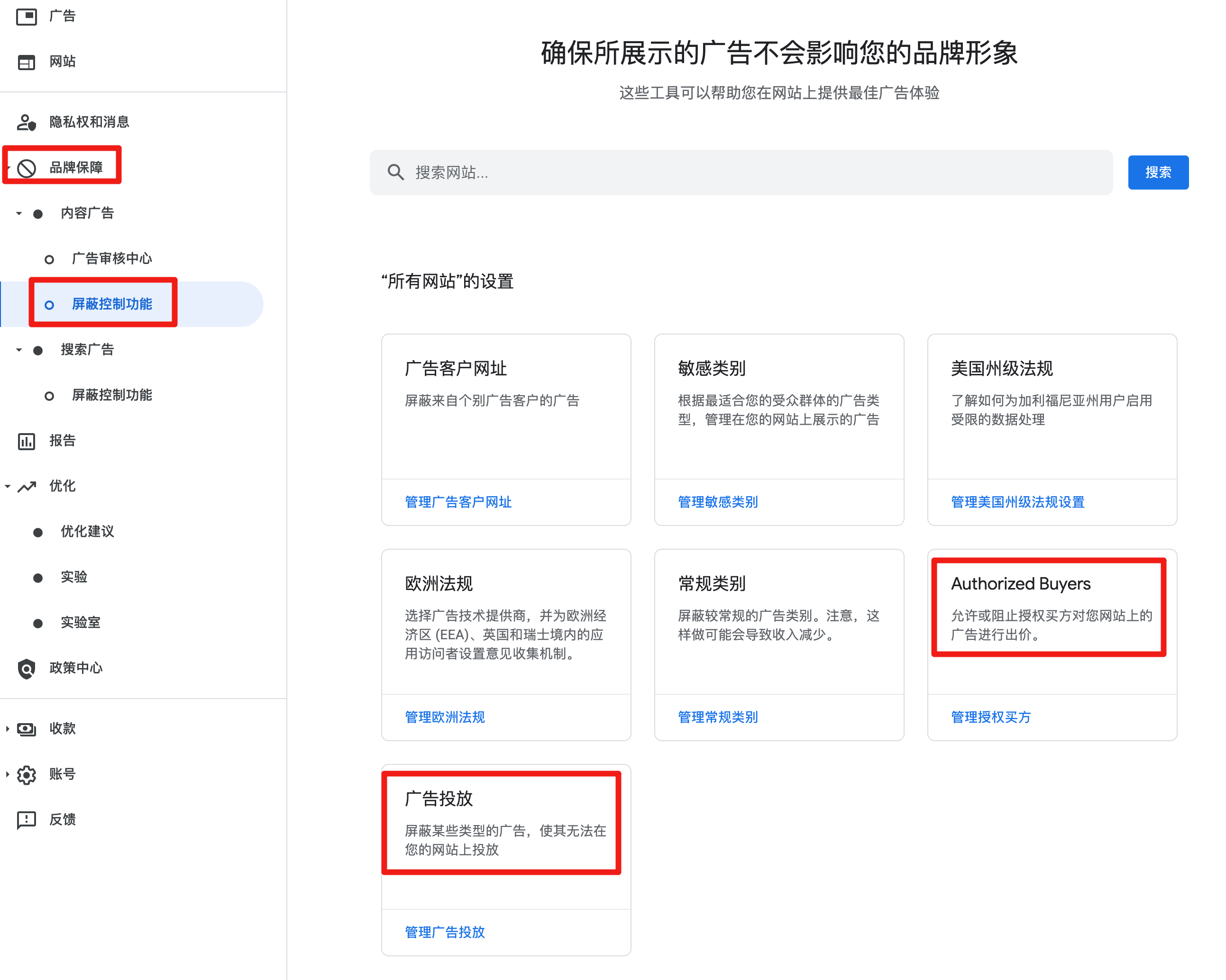 以前AdSense后台有个“品牌保障”屏蔽控制功能,可以手动禁掉一些低质网盟和你不希望展示的广告。但自2025年11月起,Google已将其替换为“授权买家”控制。除非你有明确理由,否则建议保持全部开启。关闭任何一个授权买家,都可能减少竞价者数量,从而压低你的CPC。