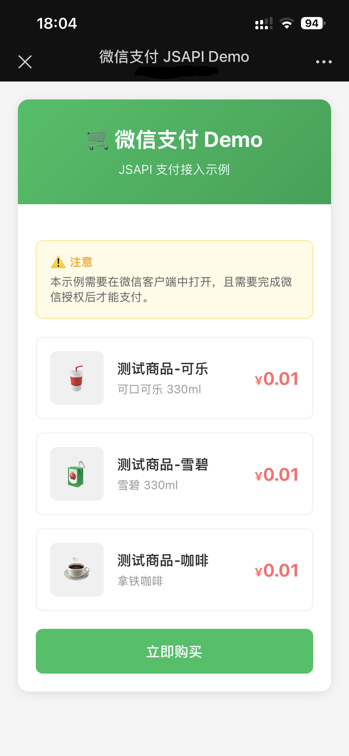 | 支付流程 | 用户点击支付 → 调起微信收银台 → 输入密码 → 支付完成 |