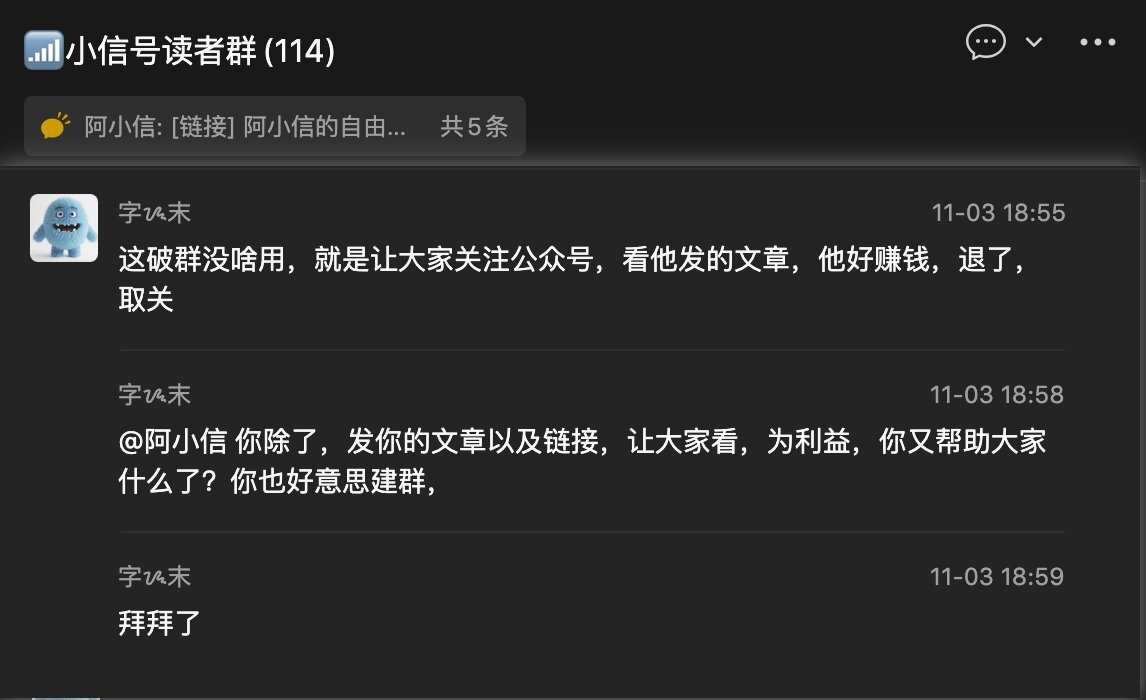在此之前,我从没在社交媒体推广过我的微信读者群,加群的都只能是通过公众号菜单或者看到了文章末尾提示的小字才能加入的。无论是提示文案还是群公告,我都说明了这个群就是我用来转发我的公众号文章的,更没有狂妄到认为自己的使命是要去帮助别人解决什么问题。所以这个人说的其实没错,我也没有生气,混互联网靠网络自由职业,挨过莫名其妙的骂多了去了,有的人确实是心态有问题。而且我就是为了我的利益而建的群,我没有遮遮掩掩,我更没有什么不好意思建群的,我建群的目的就是发我的文章,我没有割韭菜没有收过谁的钱。对于那些给我付过费的朋友,不管是赞助我的网站广告位,还是直接砸红包咨询的,我都是尽心服务,不搞虚的。