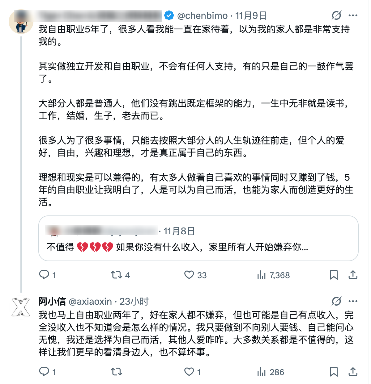 自由职业感悟:(回复别人关于家人不支持的帖子)我也马上自由职业两年了,好在家人都不嫌弃,但也可能是自己有点收入,完全没收入也不知道会是怎么样的情况。我只要做到不向别人要钱、自己能问心无愧,我还是选择为自己而活,其他人爱咋咋。大多数关系都是不值得的,这样让我们更早的看清身边人,也不算坏事。